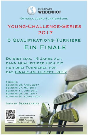 Am 07. Mai 2017 steht das zweite Qualifikationsturnier der Young- Challenge- Series 2017 auf dem Weidenhof an. Jugendliche bis 16 Jahre können sich hier mit der Teilnahme an drei der insgesamt fünf Qualifikationsturniere für das Finale am 10. September 2017 qualifizieren. Es gibt Nähere Informationen dazu finden Sie auf unserer Internetseite.