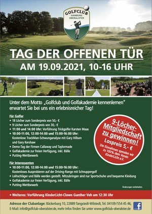 Anmeldungen sind nicht erforderlich. Weitere Informationen und die Anfangszeiten zum Golfplatz und dem „Tag der Offenen Tür“ unter: www.golfclub-oberalster.de oder beigefügten Flyer.