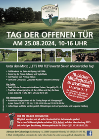 wir freuen uns, Sie herzlich zu unserem Tag der offenen Tür am 25.08.2024 einzuladen! Von 10-16 Uhr öffnen wir unsere Türen und bieten Ihnen die Gelegenheit, unseren wunderschönen Golfplatz kennenzulernen. Egal ob Sie ein erfahrener Golfer sind (9-Löcher Turnier mit Anmeldung über die PC CADDIE App) oder einfach nur neugierig auf diesen faszinierenden Sport (kostenloses schnuppern), bei uns sind Sie genau richtig.