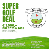 „Die 27-Loch Golfanlage Sülfeld bietet am 24.09.2023 für die ersten 15 Interessenten diesen Super Golf Deal an. Auf diesen idyllisch gelegenen Par 72 Bahnen herrscht eine sehr herzliche und familiäre Stimmung. Perfekt bettet sich der Golfplatz mit seinen abwechslungsreichen Bahnen in die schleswig-holsteinische Knicklandschaft ein und entpuppt sich somit als ein golfsportlicher und landschaftlicher Geheimtipp.