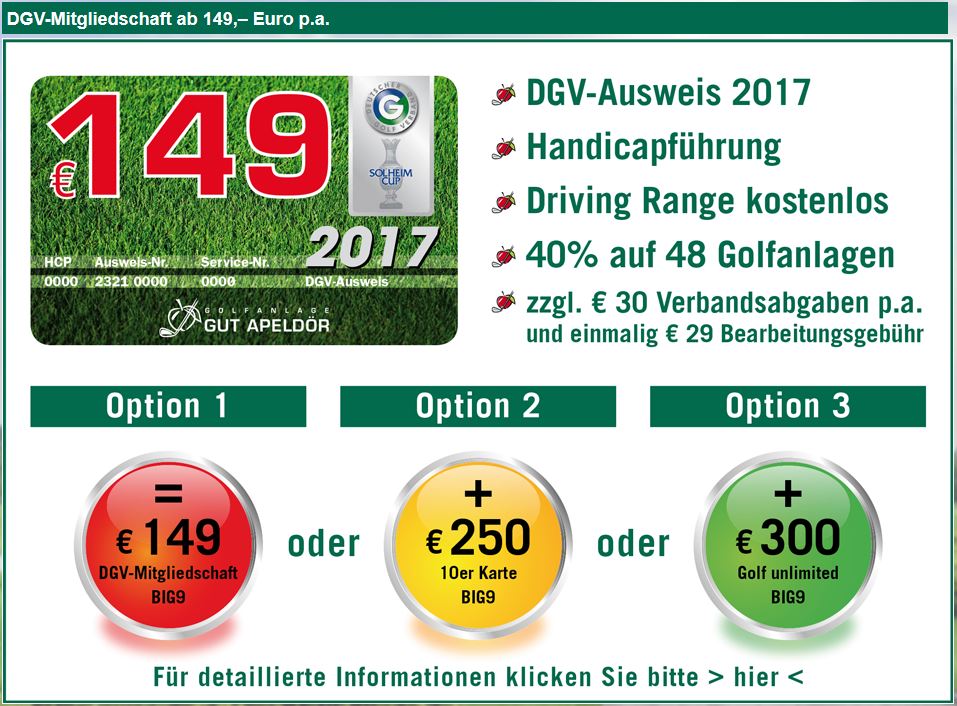 Die „flat”-rate-Mitgliedschaft berechtigt zur kostenlosen Nutzung der Driving Range, des BIG APPLE und des BIG9! Sie können somit auf der GESAMTEN Golfanlage spielen!