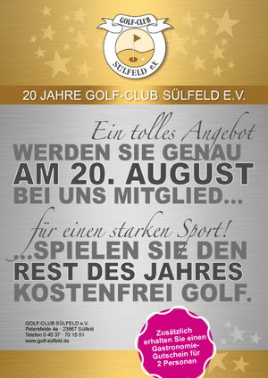 Sie interessieren sich für eine Mitgliedschaft in einem Golf-Club? Dann ist dieses Jubiläumsangebot wie für Sie gemacht: Sie treten am 20.08.2018 bei uns ein und spielen kostenlos auf unserer wunderschönen 27-Loch Anlage hier in Sülfeld bis zum Ende des Jahres. Erst für 2019 wird ein Mitgliedsbeitrag fällig. Und damit Sie sich gleich richtig einleben in Ihrem neuen Club, gibt es zusätzlich noch einen Gastronomiegutschein für 2 Personen über ein leckeres Essen ihrer Wahl.